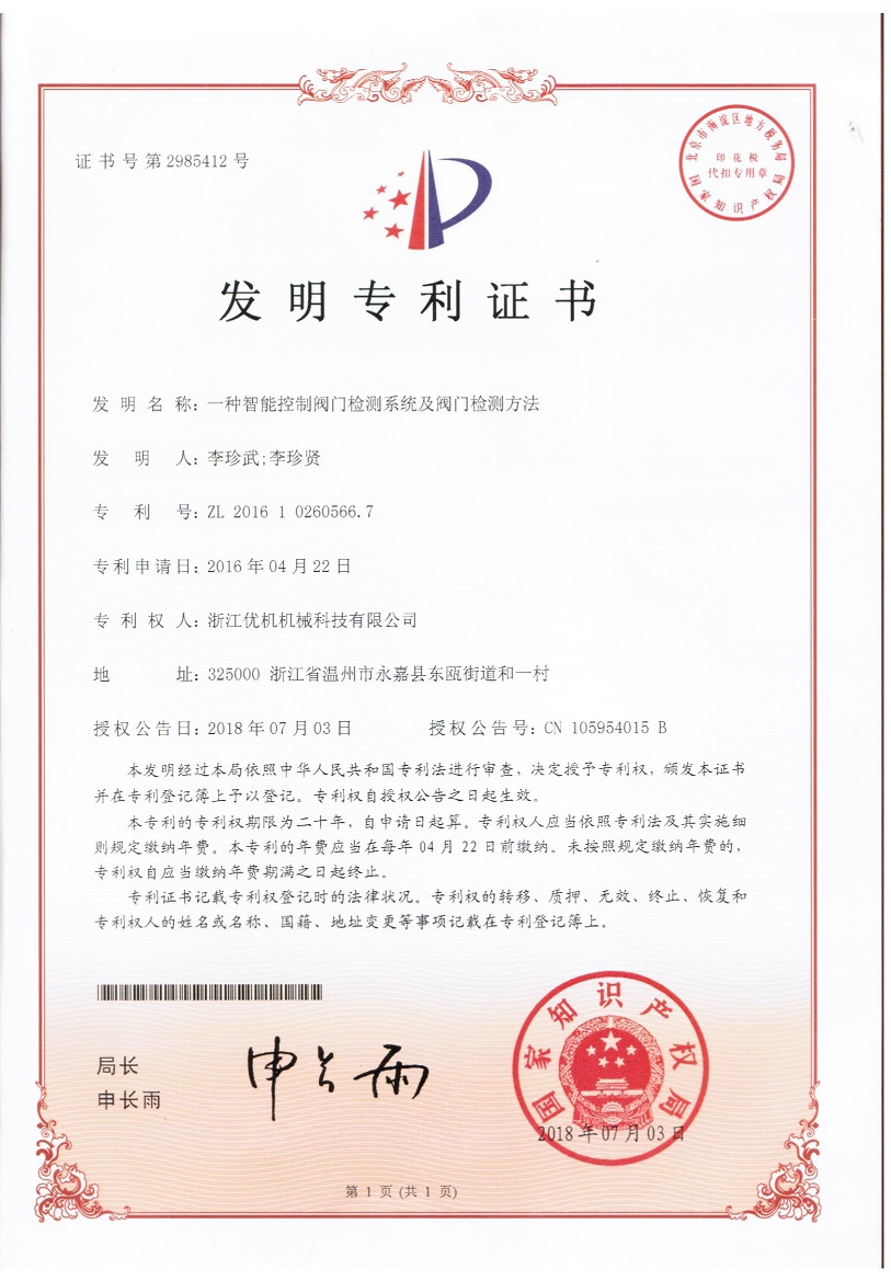 今年4月浙江優機機械科技有限公司《一種閥門檢測設備》發明專利,獲得國家知識產權局授權。捷報連連該公司16年申請的一種智能控制閥門檢測系統及檢測方法已在2018年7月03日授權公告,公告號:CN105954015B發明專利號:ZL 2016 1 0260566.7