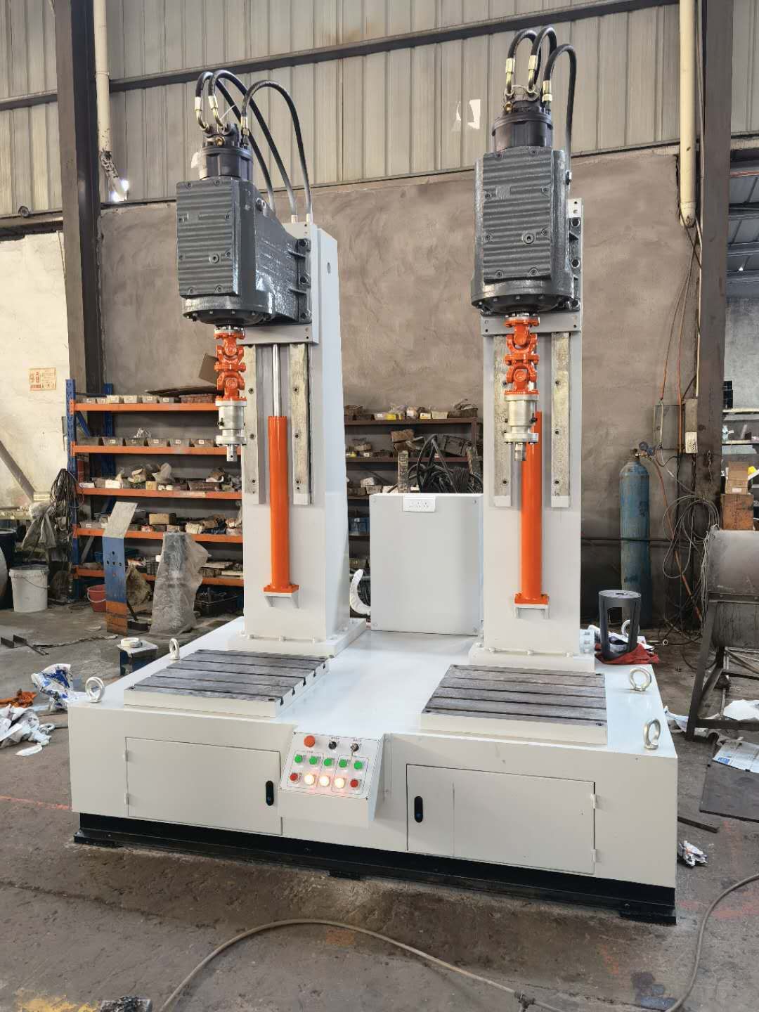 JLX型旋塞閥研磨機(jī)是針對硬密封旋塞閥密封面的研磨而精心研制的專用設(shè)備,該設(shè)備采用獨(dú)創(chuàng)的正轉(zhuǎn)360度和反轉(zhuǎn)360度,最主要的是正反轉(zhuǎn)一圈還有上下起跳5次功能方式,上下起跳功能就是解決了閥體密封面和閥芯塞密封面不會咬傷和損壞。獲得極高的加工精度、表面質(zhì)量以及批量加工的質(zhì)量一致性。JLX型旋塞閥研磨機(jī)分為一工位和兩工位研磨機(jī)、一工位研磨機(jī)和兩工位研磨機(jī)供用戶可根據(jù)要求選配。該設(shè)備通過液壓馬達(dá)來控制轉(zhuǎn)速旋轉(zhuǎn),用液壓流量來控制轉(zhuǎn)速快與慢,根據(jù)閥門口徑大小和材質(zhì)來調(diào)整轉(zhuǎn)速快慢,這樣才閥體和閥芯塞配合度為一致。用戶根據(jù)被研磨閥體的工藝要求,選擇合適的研磨劑,粗磨和精磨相結(jié)合,或閥體與閥芯塞浮動對磨。研磨頭通過液壓油缸來上升下降來實(shí)現(xiàn)。齒輪箱與主軸采用萬向節(jié)與伸縮桿鏈接,旋塞閥閥體和閥芯塞的垂直通過萬向節(jié)來變動,閥體和閥芯塞用伸縮桿來控制密封面的輕重來實(shí)現(xiàn)。裝夾誤差或其它工藝誤差。研磨劑根據(jù)用戶來選擇。JLX型旋塞閥研磨機(jī)由立柱機(jī)架、導(dǎo)軌及升降機(jī)構(gòu)、齒輪箱旋轉(zhuǎn)機(jī)構(gòu)、裝夾機(jī)構(gòu)等組成,旋轉(zhuǎn)機(jī)構(gòu)的旋轉(zhuǎn)中心線相互垂直。立柱與齒輪箱底板的升降功能通過液壓油缸來實(shí)現(xiàn),通過按鈕可進(jìn)行上升或下降。