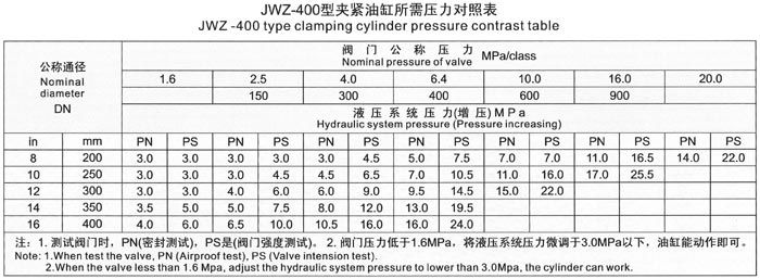 The test range of valve nominal diameter and nominal pressure for JWZ-400 model