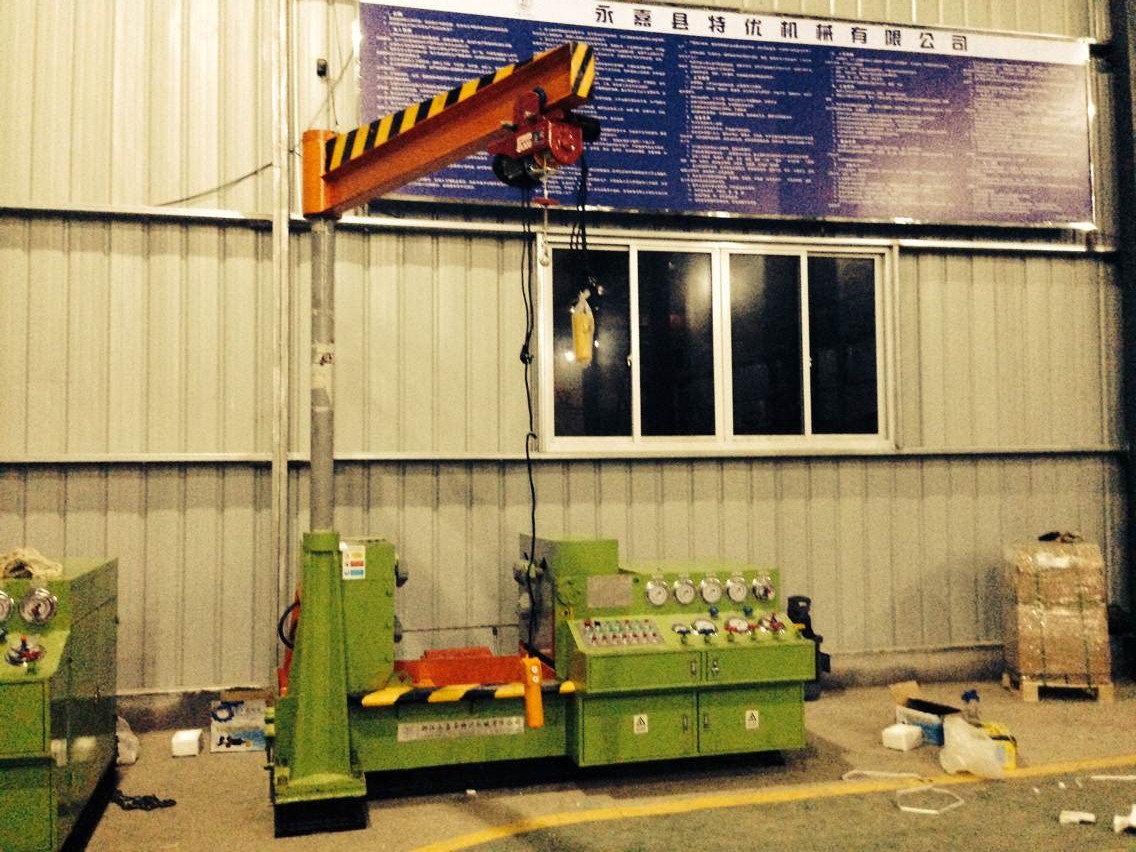 三、接通電源,按油泵啟動按鈕,檢查電機轉動方向,是否正確(順時針方向)進行5—1 O分鐘空載運轉后,調節油泵壓力在5 0MPa進行試機,各種動作,檢查各管路有無泄漏,發現不良現象,應立即停機排除。